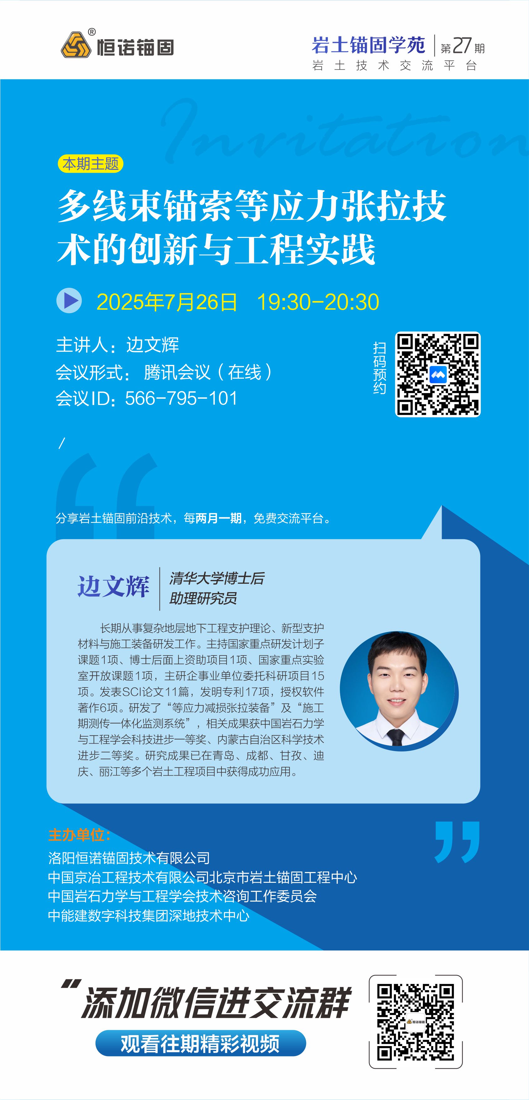 巖土錨固學苑將于2025年7月26日(周六)19:30-20:30舉辦第27期,本期主題:多線束錨索等應力張拉技術(shù)的創(chuàng)新與工程實踐,歡迎廣大巖土錨固領(lǐng)域愛好者參與交流。