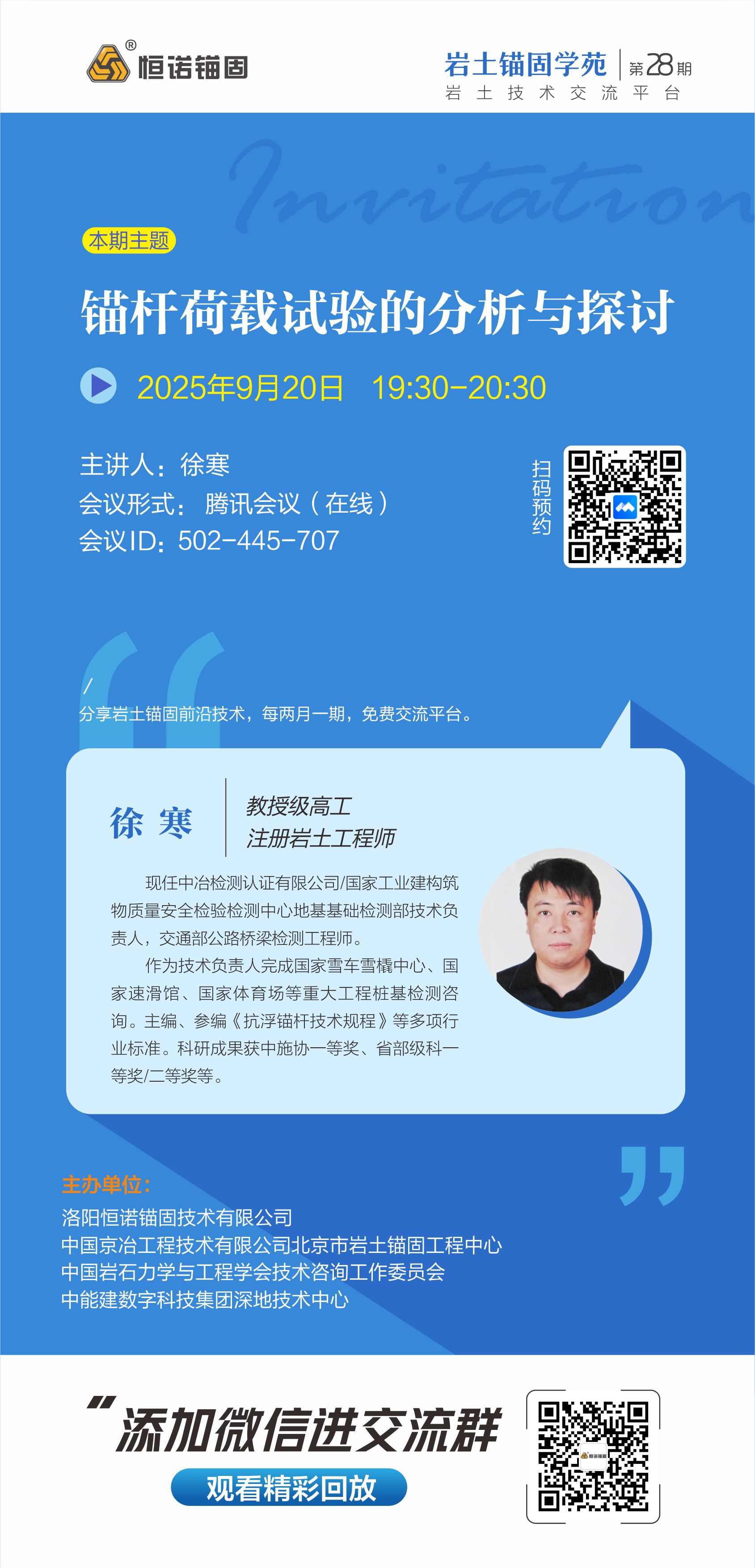 巖土錨固學苑將于2025年9月20日(周六)19:30-20:30舉辦第28期,本期主題:錨桿荷載試驗的分析與探討,歡迎廣大巖土錨固領域愛好者參與交流。